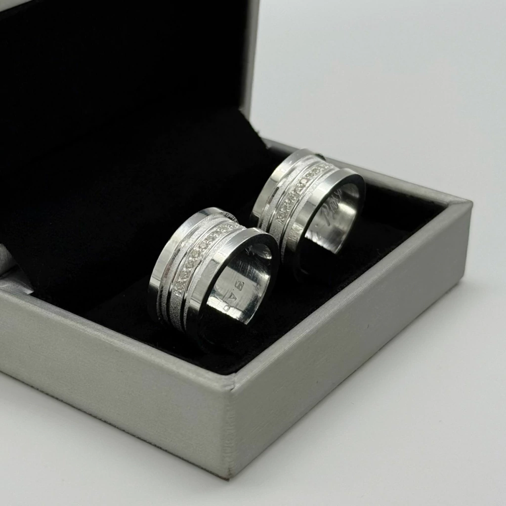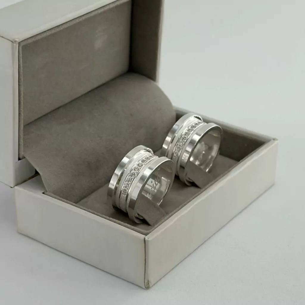 Metal: Aliança em prata legítima 950. | Ambas com 15 pedras de zircônia.