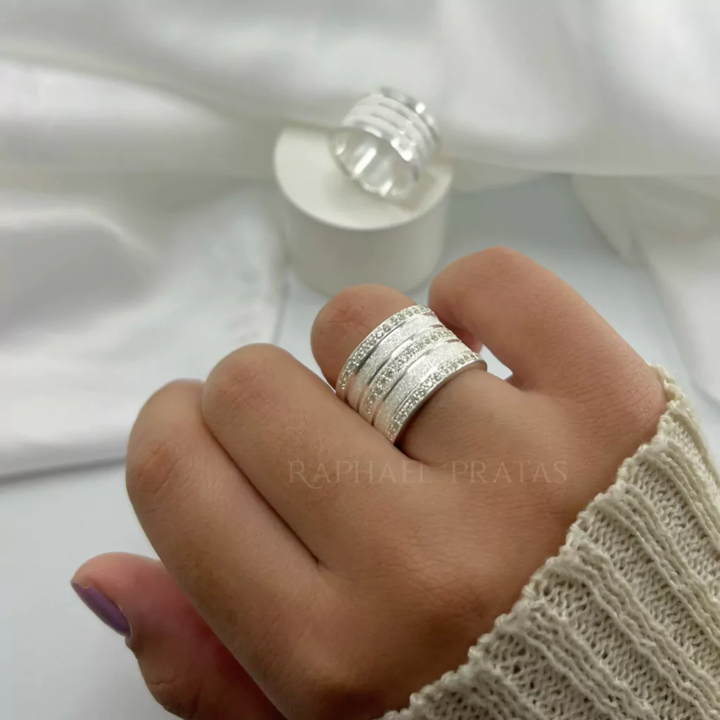 Metal: Aliança em prata legítima 950. | 45 pedras de zircônia em um dos aros.