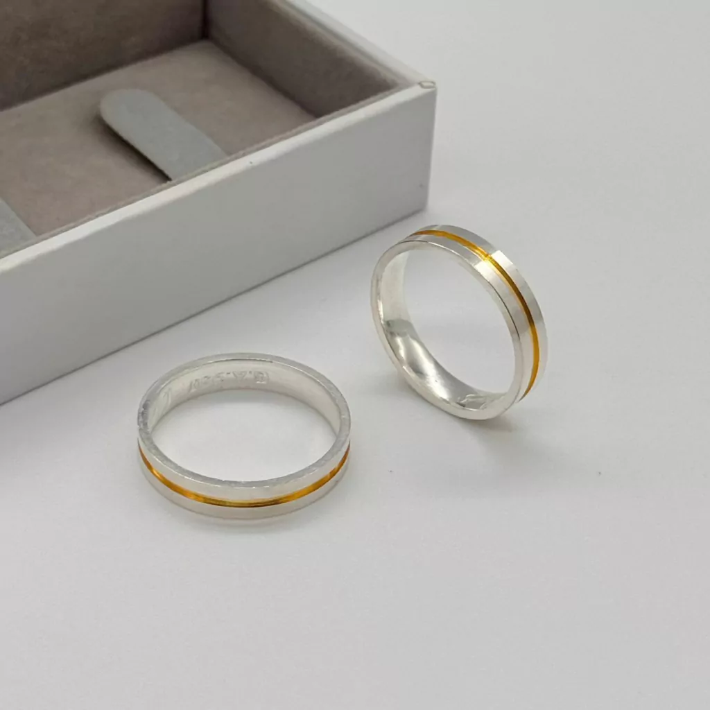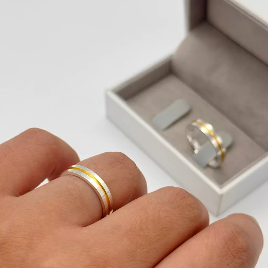 Metal: Aliança em prata legítima 950 com filetes banhados a ouro.