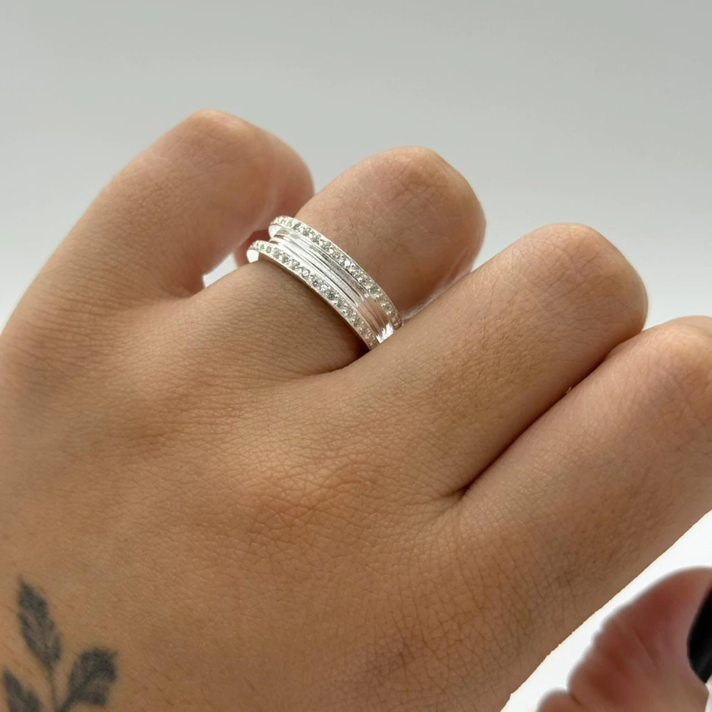 Largura: Aproximadamente 6mm. | Um aro com duas fileiras completas de pedras em zircônia. | Gravação lateral a escolha do cliente.